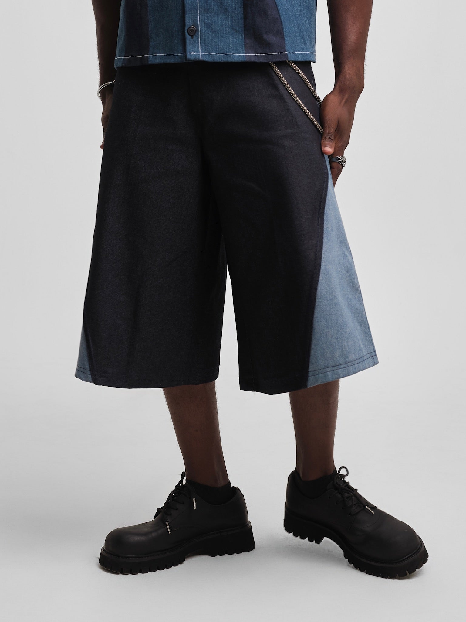 Wide-leg culottes crafted from upcycled mixed-wash denim, designed with contrast panel construction that enhances natural flow and volume. An abstract hand-painted motif on one back pocket adds a quiet artistic signature, bringing depth and individuality to the clean silhouette. Each pair is one of one, celebrating texture, movement, and intentional sustainable craftsmanship.
