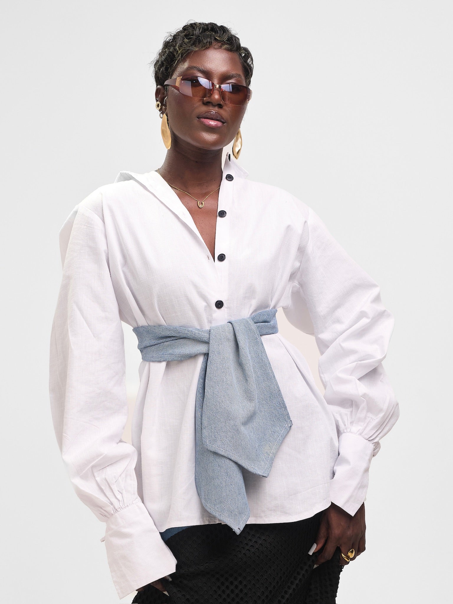 A classic white button-down reimagined through modular design. The Convertible Denim Drape Shirt features a detachable denim drape secured with buttons along the upper back, allowing the silhouette to shift effortlessly. Light-wash denim strips can fall freely, be crossed over the shoulders as soft panels, or tied at the waist for a sculptural wrap effect. Thoughtfully crafted from upcycled denim, this piece offers fluid styling versatility while remaining rooted in Vintage Culture Studio’s experimental, sustainable craftsmanship.