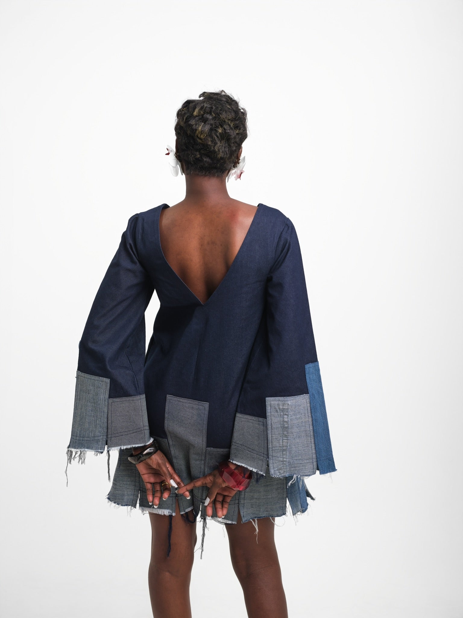 A modern reinterpretation of a classic silhouette, The Little Denim Dress is crafted from upcycled mixed-wash denim. The patchwork construction and subtle frayed edges add texture and character, while the clean A-line cut keeps the look effortless and versatile. Designed as a one-of-a-kind statement, this dress brings together structure, movement, and sustainable craftsmanship in one timeless piece.
