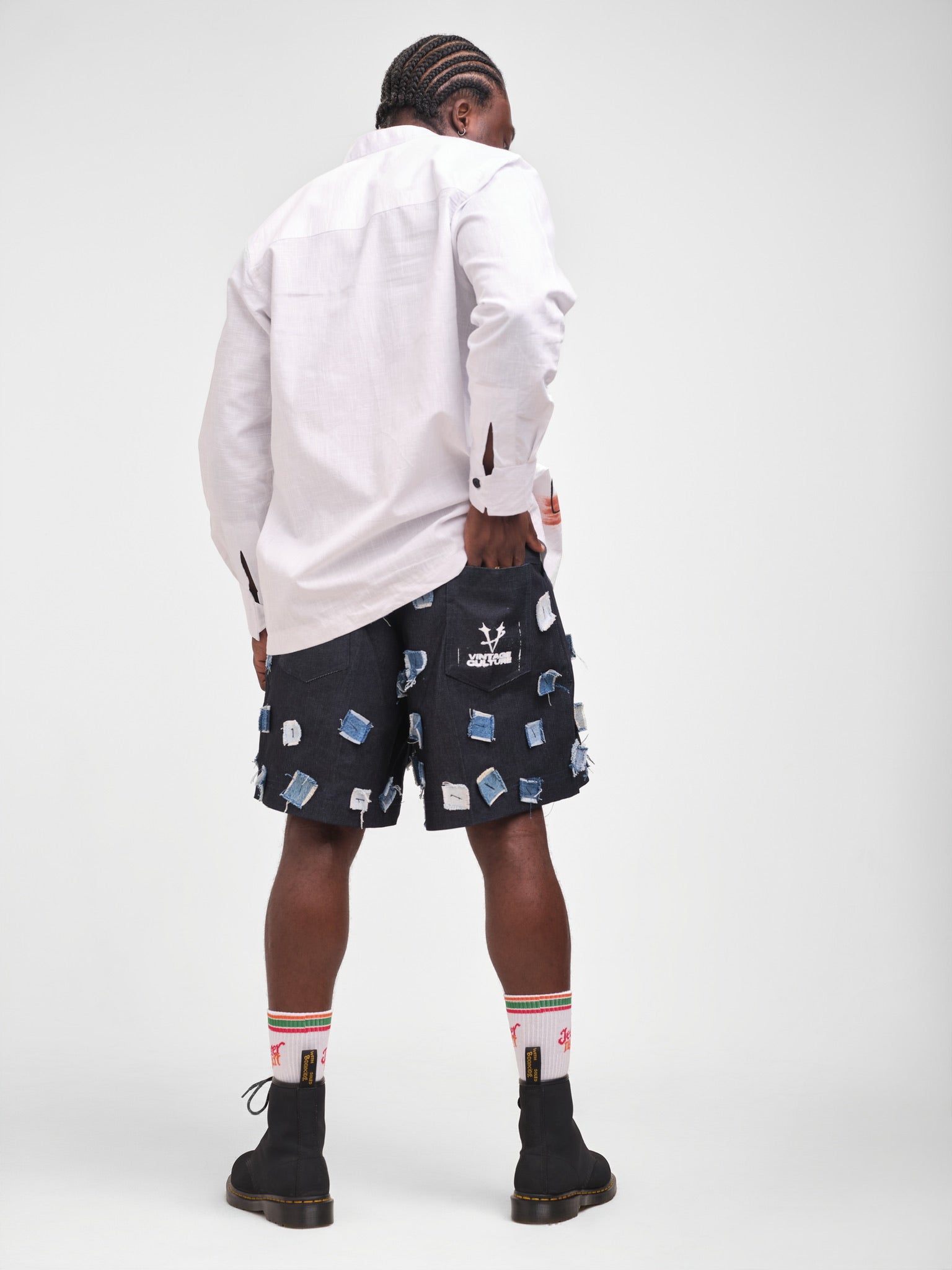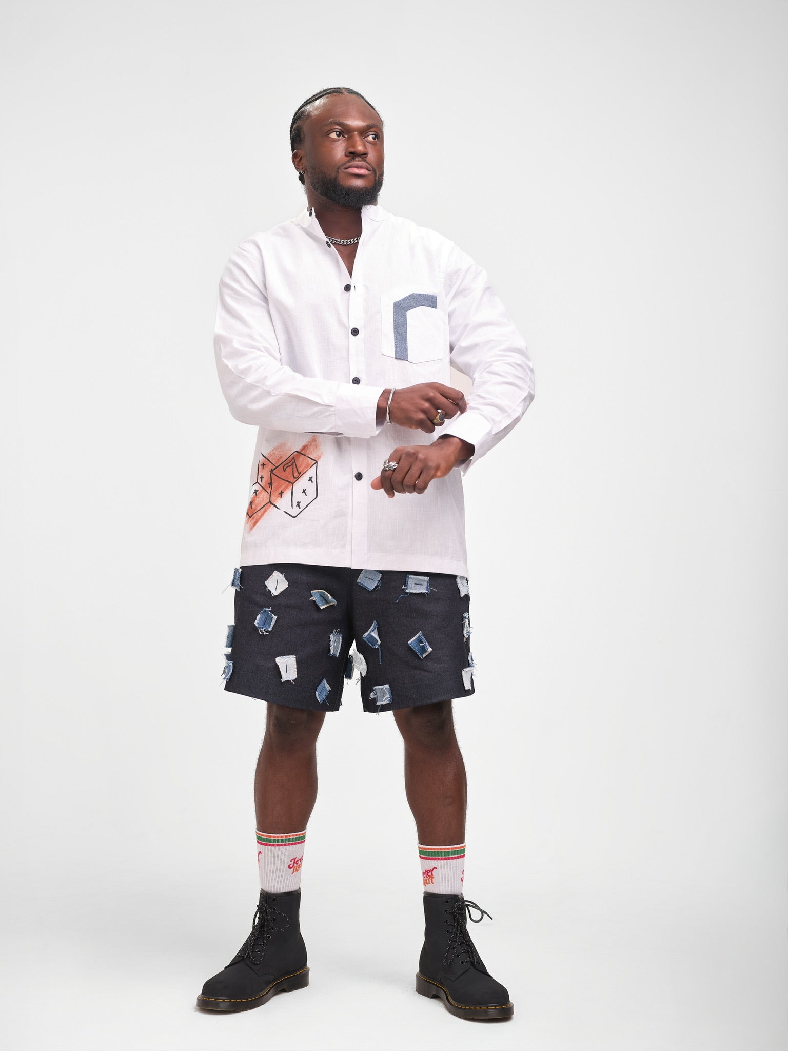 The Patch & Paint Set blends playful reconstruction with hand-crafted artistry. The look pairs a crisp drafted linen shirt featuring a hand-painted abstract motif with the Patch Grid Shorts — a reworked denim piece covered in individually placed square patches. Together, the contrast of clean linen, hand-painted detail, and textured patchwork creates a set that feels expressive, modern, and rooted in sustainable design.