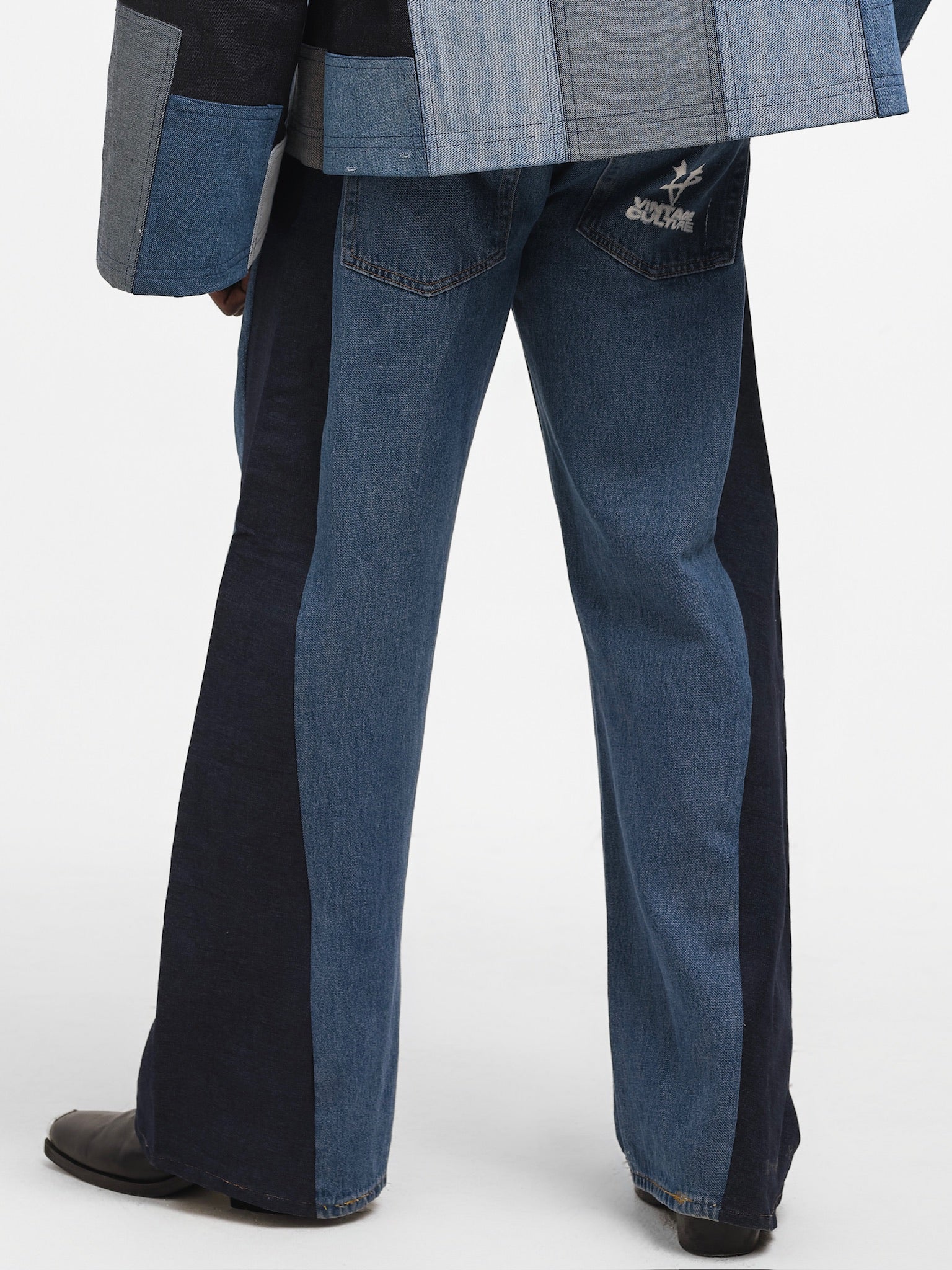 Created using 1 reclaimed denim pants, extending the life of existing garments and reducing textile waste. Each pair is one-of-one, celebrating material reuse and conscious production.
