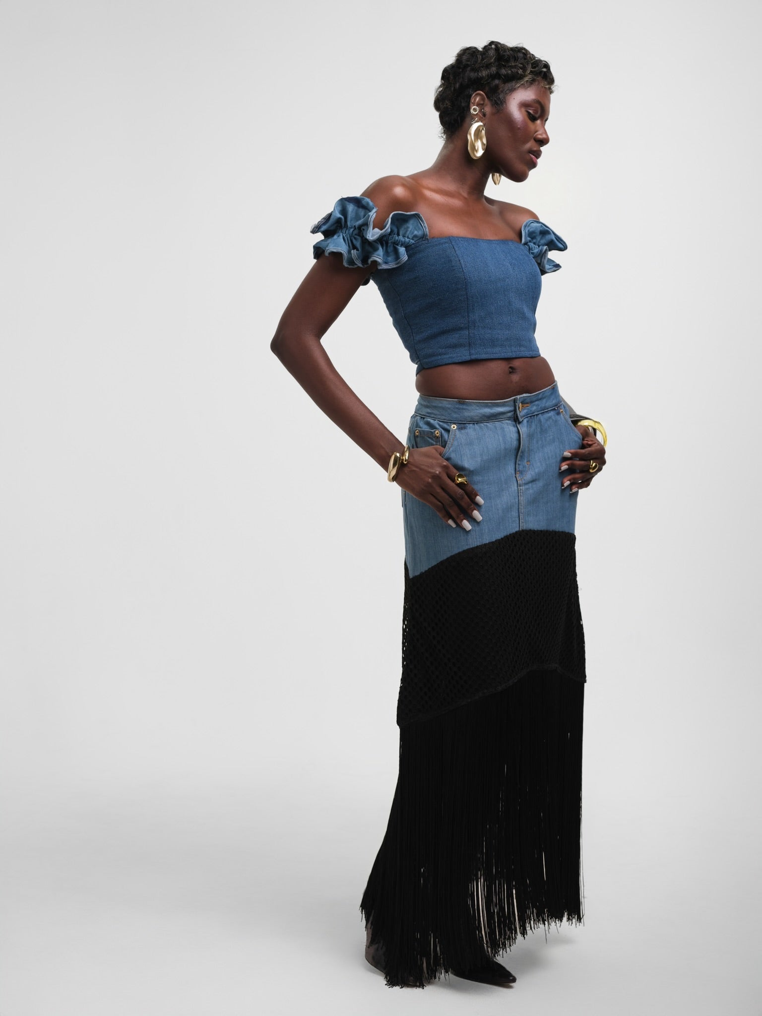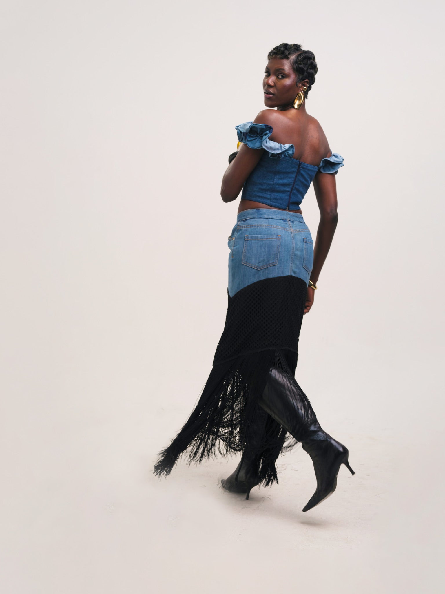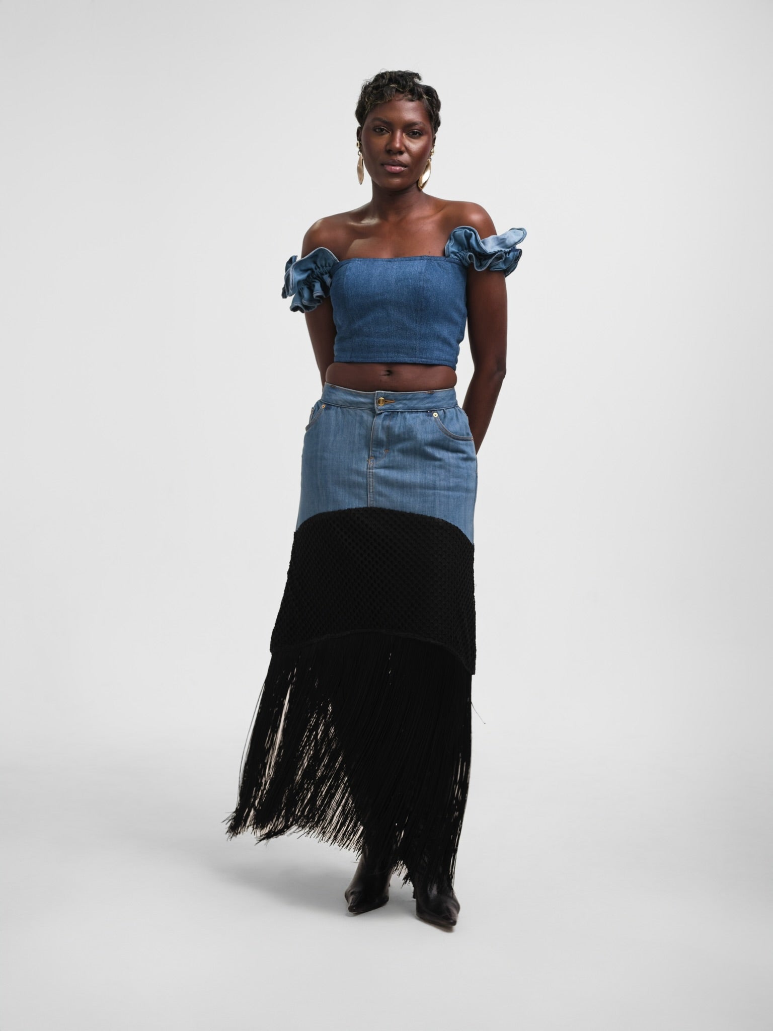 A playful two-piece set blending structure and movement. The off-shoulder ruffle Bardot top is crafted from reworked denim, sculpting the upper body while adding soft, romantic volume through the sleeves. Paired with a high-waisted upcycled denim skirt that flows into a dramatic black fringe hem, the look creates fluid motion with every step — an elevated celebration of texture, contrast, and sustainable artistry.